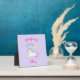 A photo plaque with an adorable white unicorn with pastel green, purple, yellow and pink curly mane and tail. This magical creature is laying down sleeping peacefully with a rainbow coloured shooting star flying above. Text says "Magical Vibes" in a pink trendy font. Pastel purple and white polka dot background.