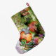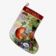 Hang this magical, large (12" x 20") double-sided stocking by the chimney with care! This unique, artistic design features a different whimsical scene on each side. On one side, a friendly snowman, a tiny mouse, a cute eagle hanging upside down, and a bird perch on a shiny ornament, with a personalized name banner for a custom touch. The reverse side reveals a sweet, sleepy reindeer ornament, adding to the festive charm. This stocking is the perfect way to add a touch of artistic wonder to your holiday decor.