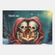 Magical winter moments, two skeletons reading by candlelight on a winter night. Two skeletons cuddle lovingly under a red blanket while reading a book together. A small candle provides warm, diffused light, making the scene cozy and slightly mysterious. In the background, stars and snowflakes shine in the dark sky, while snow lies on the floor and ceiling. The winter landscape with pine trees creates a tranquil, enchanting atmosphere full of warmth and magic.