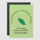 Green leaf with business info. Replace green graphic leaf with your business logo. Above leaf is line of curved text in green. Beneath is place to personalize with address and phone number in black. Pale green background may also be customized.