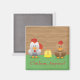 L'aimant coloré du réfrigérateur est livré avec un joli dessin animé de poulet jaune, poule brune et coq blanc et un arrière - plan de grains de bois et message personnalisable. Le message actuel dit "Poulet à qui que ce soit ?