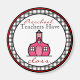 Un aimant pour les enseignants avec le logo de The Pink Schoolhouse à l'intérieur d'un cercle en forme de cadre en vichy noir avec garniture rouge. Le texte en noir et rouge dit : "Les enseignants de maternelle ont cours."