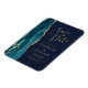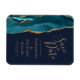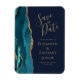 Cet élégant aimant moderne pour enregistrer la date présente une bordure d'agate aquarelle turquoise bleu ornée de paillettes d'or faux. Personnalisez facilement le texte de couleur or sur fond bleu marine.