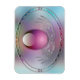 Un décor bleu pastel, lavande et rose avec un oeuf rose translucide dans un cadre argenté, entouré d'un cadre ovale argenté clair et composé de quatre pierres précieuses plus lisses comme des oeufs colorés.