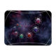 Illustration de l'infini, traversant l'univers pour combiner le microscopique et le télescopique dans un arc-en-ciel de formes et de couleurs. Colonne d'atomes multicolores de bleu, rose, rouge et vert entourés d'anneaux d'argent, qui traversent l'espace en spirale sur fond de galaxies fractales colorées.