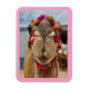 Cet aimant a une bordure rose et montre un closeup d'un très mignon chameau. Portant un halter coloré, ce chameau féminin avec ses grands yeux bruns, ses longs cils, sa bouche et son nez floues rendent cet aimant irrésistible à tous les amoureux des animaux.