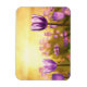Un soleil doré se levant sur un champ de tulipes violettes.