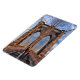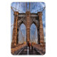 Photographie couleur du pont Brooklyn à New York contre ciel bleu nuageux.