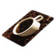 Cet aimant flexible affiche une tasse de café fraîchement moulu à la vapeur, blanc, sur un lit de grains de café rôtis brun foncé.