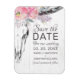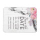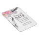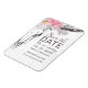 Annoncez votre fiançailles mariage à la famille et aux amis avec ce style boho enregistrer l'aimant de date. Ce modèle de design à thème rustique dispose d'un crâne de vache peint à la main et portant une coiffure rose couleur rose vif sur un arrière - plan de bois patiné blanc et gris. La carte se lit dans le script gris fusain "Changer la date, pour notre mariage" avec votre date de mariage et les noms à personnaliser. Le verso de la carte postale a plus de détails de votre mariage à customiser également. Conçu par l'artiste Susan Coffey.