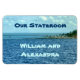 Les bleus et les aquas de la mer et du ciel et le bord d'une petite île sont l'arrière - plan de cet aimant que vous pouvez customiser avec votre nom et informations de croisière pour votre croisière en famille ou en groupe. Vue mer depuis un bateau de croisière. Utilisez-le pour un marqueur de porte d'entrée de salle de séjour et faites-le un souvenir soigné après.