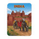 Deux éléphants avec coureurs sont vus devant un grand fort indien historique, baigné de lumière du soleil sous un ciel bleu clair.