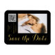 Save The Date Black Gold Stylish Script Modern Mariage Magnets dispose d'un arrière - plan noir avec votre photo personnalisée. Personnalisez avec votre texte en modifiant le texte dans les zones de texte fournies et ajoutez l'URL de votre site Web pour votre code QR personnalisé. Conçu pour vous par ©Evco Studio www.zazzle.com/store/evcostudio