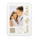 Save The Date White Gold Script élégant Le Magnet Mariage moderne dispose d'un arrière - plan blanc avec votre photo personnalisée. Personnalisez avec votre texte en modifiant le texte dans les zones de texte fournies et ajoutez l'URL de votre site Web pour votre code QR personnalisé. Conçu pour vous par ©Evco Studio www.zazzle.com/store/evcostudio