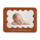 Magnet de faire-part de naissance moderne avec la photo de votre bébé nichée à l'intérieur d'un cadre en terre cuite en forme de coquille. Personnalisez le magnet de faire-part de naissance en terre cuite en ajoutant le nom de votre bébé et des informations supplémentaires en lettrage blanc.