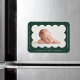 Aimant de faire-part de naissance moderne comportant la photo de votre bébé nichée à l'intérieur d'un cadre festonné vert forêt. Personnalisez l'aimant de faire-part de naissance vert forêt en ajoutant le nom de votre bébé et des informations supplémentaires en lettrage blanc.