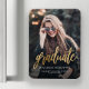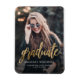 Faire-part de remise de diplôme magnétique moderne comportant une photo verticale personnalisée. Le mot "diplômé" apparaît en script de faux-feuille or, avec le nom du diplômé, l'école et l'année de remise des diplômes en dessous en police sans empattement blanche. Remplacez facilement l'image exemple par la photo de votre propre diplômé. Un écran dégradé noir aide à faire ressortir le texte. Idéal pour la remise des diplômes de lycée ou d'université.