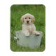 Purebred golden retriaturve puppy taking a bath outdoors in a cream colored vintage washtub sitting in the grass with her paws on the edge. She est à adorable fluffy blonde fawn baby dog with brown eyes and a black nose.
