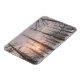 Un soleil d'hiver pâle se couche derrière des mélèzes imposants comme des sentinelles sombres. Leurs branches grillées, nues, sauf pour un piqué de neige, et les dorures pastel, roses et bleus du ciel couché de soleil sont vus comme à travers une brume rêveuse. Au premier plan, les flocons de neige tombent doucement.