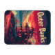 Une description charmante et nostalgique des Outer Banks, en Caroline du Nord, connue pour ses vastes plages, ses phares historiques et son charme côtier. Le design saisit la beauté naturelle de la région avec ses rivages sablonneux, ses dunes roulantes et ses monuments emblématiques comme le phare de Cape Hatteras, tous illustrés dans un style vintage. Cette oeuvre évoque l'atmosphère tranquille et pittoresque des Outer Banks, invitant les spectateurs à découvrir son charme intemporel et son attrait balnéaire.