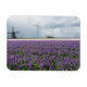 Aimant souvenir avec un paysage avec un moulin à vent traditionnel et plusieurs moulins à vent modernes pour générer de l'énergie verte derrière un champ avec la fleur d'hyacinthe violet dans la région bulbe en Hollande.