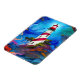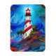 Beau phare rayé rouge et blanc sur une roche surélevée entourée de vents et d'eaux tourbillonnants colorés AI Art créé par minx267