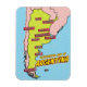 Cette carte illustrée de l'Argentine est rendue dans un style pop art dynamique. La carte est dessinée en noir et remplie d'une couleur jaune vif, placée contre un arrière - plan bleu avec un motif pointillé. Les principales villes d'Argentine sont étiquetées en boîtes bleues.