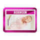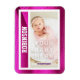 Commémorez la naissance de votre beau bébé en l'immortalisant sur leur tout premier carte de baseball. Ajoutez simplement la photo de votre bébé, et modifiez les prénoms et nom de famille ainsi que le nom de l'équipe, qui est également le nom de famille. La bordure de la carte magnétique est une image de tissu en maille rose couramment utilisée pour les uniformes sportifs.
