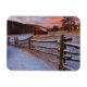 Cette photo présente une grange rustique recouverte de neige devant un beau coucher de soleil sur un ranch du Colorado.