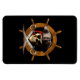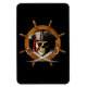 Aargh ! Crâne pirate, écusson, casquette pirate et épées croisées au-dessus de la roue d'un ancien bateau en bois.