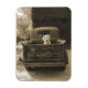 Sortez de Dodge par Jim Dratfield. Cette photo sépia est celle d'un chien mignon assis heureux à l'arrière d'un pick-up.