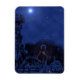 La crèche bleu ciel présente Marie et Joseph sous un ciel étoilé lumineux.