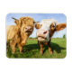 Un gros plan de ces deux vaches écossaises des hautes terres drôles, jeunes, curieux. Le bétail est souvent utilisé pour le pâturage de Conservation. Robustes et poilus, ils peuvent résister à n'importe quel temps. Les cornes nous disent qu'elles ont environ 18 mois.