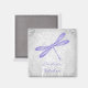 Ajoutez une touche de couleur à votre cuisine avec un aimant personnalisé de libellule violette. La conception de l'aimant comprend une libellule colorée, une vigne feuillue blanche molle contre un arrière - plan damassé gris clair avec une zone à personnaliser avec votre nom. Autres cadeaux disponibles avec ce design ainsi qu'une variété de couleurs.