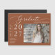 Yay ! Votre collège, lycée, collège/université, école de technologie, ou étudiant de programme d'études supérieures l'a fait et est diplômé! Célébrez l'un des moments précieux de leur vie et envoyez cette carte magnétique faire-part de graduation. L'aimant présente un style minimaliste moderne simple et élégant, avec de beaux scripts de calligraphie sur un arrière - plan en terre cuite et la photo du diplômé. Il suffit de customiser et de remplacer le texte et les photos dans la zone de personnalisation. Remarque : les phrases élégantes du script de calligraphie "diplômé" ainsi que les lignes et autres illustrations graphiques et éléments ne peuvent pas être modifiées, supprimées ou déplacées. Elles sont réparées.