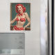 Cette illustration captivante met en scène une pin-up au style rétro, incarnant l'élégance et le charme des années 50. Avec ses boucles rouges flamboyantes et son regard envoutant, elle arbore un bikini rouge à pois blancs et un nœud assorti autour du cou, rappelant l'esthétique vintage des affiches glamour de l'époque. Le décor en bois patiné et aux teintes vertes contraste subtilement avec la chaleur de son teint et l'éclat de sa tenue, ajoutant une touche de nostalgie et de sophistication à l'ensemble.