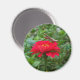 round magnet (available also in square shape, and other sizes and prices) with photo of red zinnia and a praying mantis perched on top of it