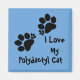 Paw prints and text on blue background. Left and right prints of polydactyl (seven toes) cat. Text beneath reads "I Love My Polydactyl Cat"