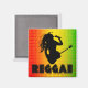 Reggae Rastaman - © Sunny Mars Designs. Le jamaïcain Cool Reggae, frigo carré ou aimant frigo avec la silhouette d'un homme rastafarien chantant du reggae et jouant de la guitare sur un arrière - plan abstrait aux couleurs de la Jamaïque verte, jaune et rouge.