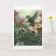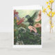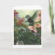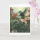 Beautiful painting by Wendy Carter of a hummingbird in the garden with nymphs hiding in the flowers.