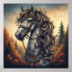 Magnificent horse adorned with intricate golden jewellery amidst a vibrant autumn forest landscape. The image captures a fantasy-like atmosphere with vivid colours, elegance, and natural scenery.