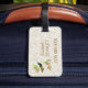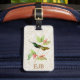 Personalized luggage tag with a vintage illustration of the Magnificent Hummingbird - a green and gold hummingbird perched on a tropical plant with coral pink flowers, on a light gold marble texture background.