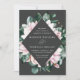 Elegant floral wedding invitations featuring your wedding details surrounded by a geometric frame of watercolor pink magnolia flowers and green eucalyptus leaves against a charcoal grey background. The reverse side of the magnolia wedding invitations features a solid eucalyptus green background. Designed to coordinate with our Magnolia & Eucalyptus wedding collection.