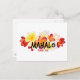 Bright watercolor plumeria flowers in reds, oranges and yellows with Mahalo (thank you) text