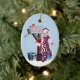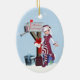 A cute "Holiday Greetings" Mail Carrier Elf double sided ceramic holiday ornament. This fun holiday ornament features a cute elf girl with a letter in her hand, standing next to a mailbox with presents at her feet! The mailbox has a red gift inside with a golden bow, and a bright red bow on it too. All are in front of a cheery blue wintery snow falling background. The mailbox also reads "Holiday Greetings" Digital art by XG Designs NYC. A great gift for friends, family or a special mail carrier, mailman, or mail woman! For more occupational, mail carrier holiday cards and gifts please visit our shop!