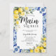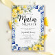 Main Squeeze lemon bridal shower invitation with blue tile design, citrus lemons, and floral details. Ideal for lemon themed bridal shower ideas, lemon and blue bridal shower theme, and Italian bridal shower celebrations.
