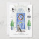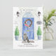 Announce your new address with our stylish announcement featuring a Maine Coon cat, blue front door, welcome mat, slate sign, topiaries and a floral wreath set on a grey brick background.