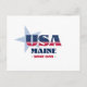Maine postcard. A creative typography design that encapsulates Maine's essence with bold red, white, and blue colours, and patriotic elements, including stars and stripes.