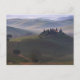 Carte postale d'une ferme dans le brouillard matinal à l'aube en Toscane entre les collines vallonnées de la vallée du Val d'Orcia entre Pienza et San Quirico d'Orcia en Italie.