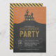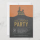Cette invitation à la fête de l'halloween à l'effervescence présente une illustration de maison hantée.